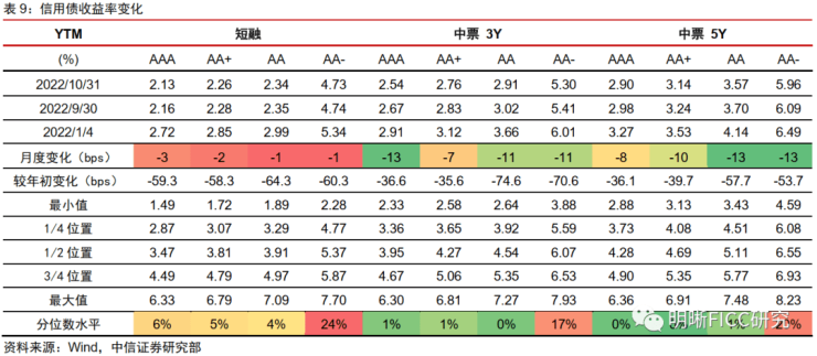 信用债收益率整体下行。2022年10月,1/3/5年国开债收益率分别变动-3bps、-10bps和-11bps。与此同时,信用债收益率曲线也整体下行。从历史分位数来看,目前中高等级信用债收益率处于历史极低位置,低等级也处于25%以下历史分位数。