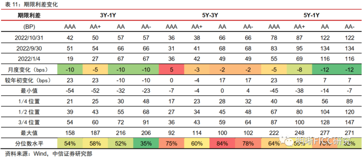 期限利差大幅压缩。2022年10月,做平曲线的策略收益很好,3Y-1Y期限利差压缩约10bps。当前主要期限利差仍在历史中位数以上,有继续压缩的空间。