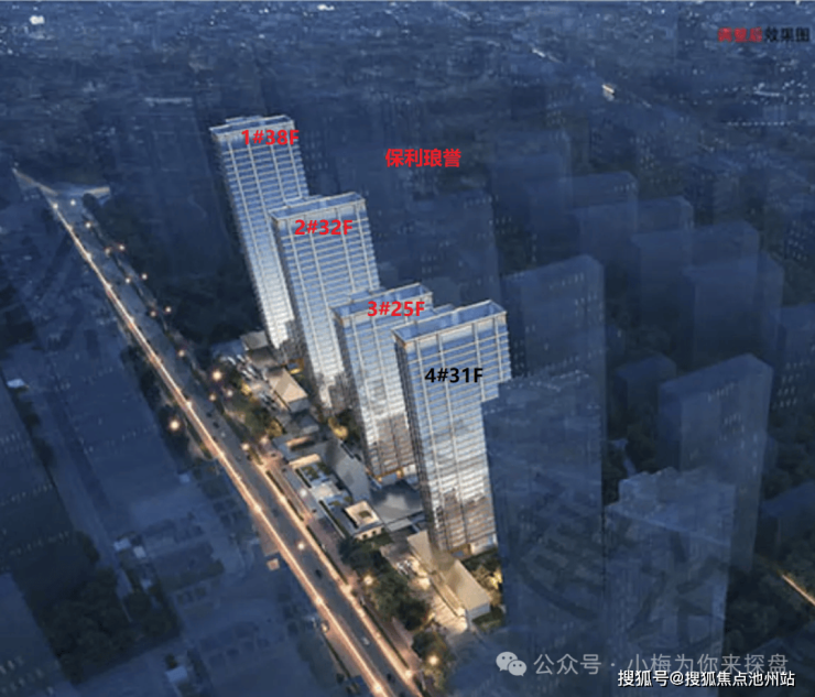保利琅誉即保利城四期-B区北片项目,共四栋住宅楼,其中1#38F,2#32F,3#25F,4#31F,2、3、4#都有架空层。保利琅誉一共360户,车位配比1:1.09。