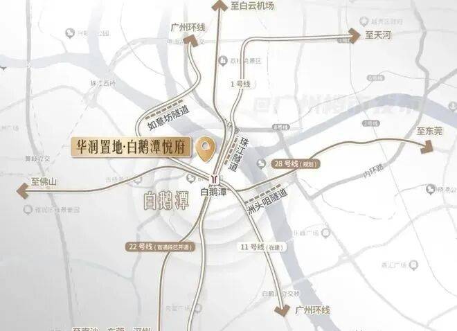 白鹅潭悦府距离地铁芳村站约400米,片区未来1号线、11/22号线(在建)、以及规划中的28号线等4条地铁交汇,业主可以直达越秀、天河、海珠,都算是非常便利。