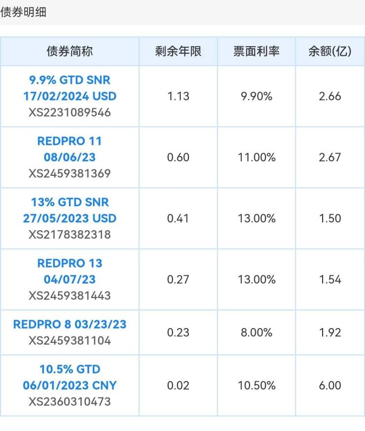 焦点财经查询发现,目前力高集团境外债券有6只,票面利率最高为8%到13%之间,即将到期的是GTD06/01/2023CNY,债券余额为6亿美元,票面利率为10.5%,到期时间为2023年1月6日,这意味着距离最近偿债时间仅剩7天。