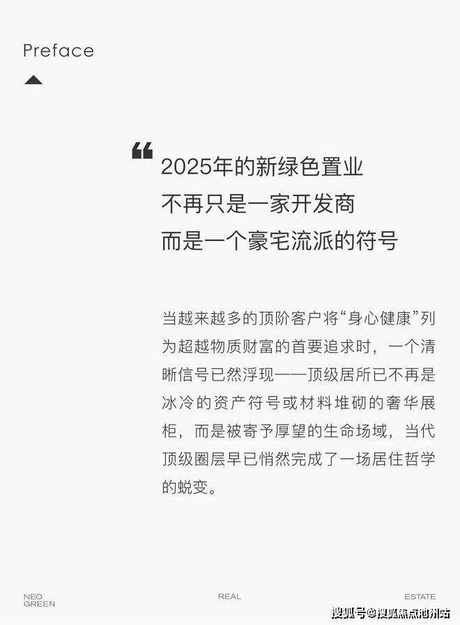 新绿色精准捕捉到高净值人群对身、心、神三大生命场的全维健康需求,在豪宅的“普世”价值之上,打破资源壁垒,开创性地提出“奢养”的概念、首创了“三养一生”的奢养豪宅体系,全力打造“提高生命质量的豪宅”。