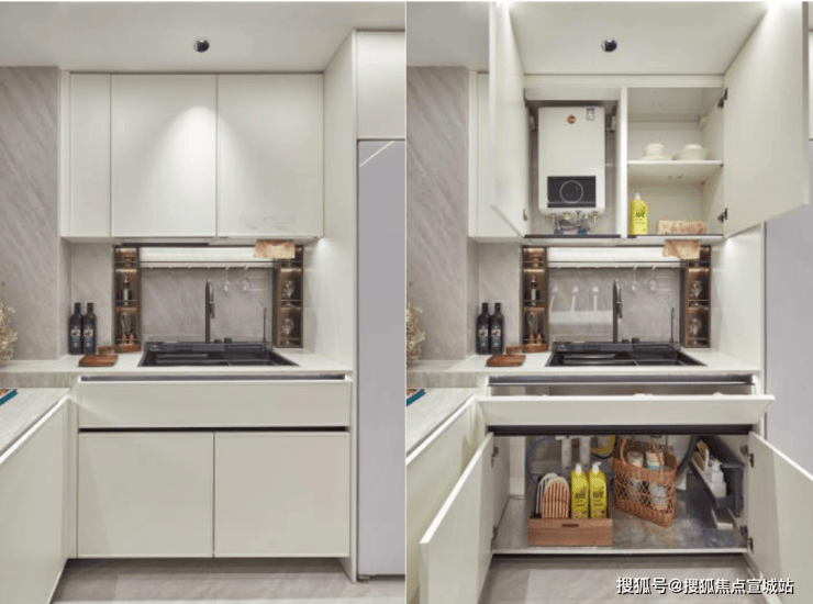 从 5大收纳区的镂空玄关柜,到分类更细致的卫浴空间,再到 厨房的5大分区,以及更惊喜的 餐边柜,划分6大功能区,全屋收纳量飙升!