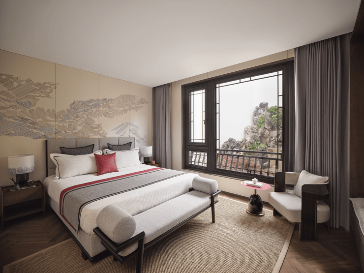 堪称神来之笔,它为这东方院落注入了自然的灵魂:每个房间,朝内永远有一片落地玻璃框出的园景。