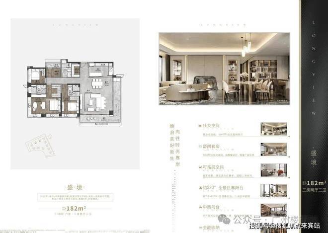 建面177-182㎡四房三卫,三开间朝南,开间达到6米,餐客厅面积达到50平,16米长的270度转角大阳台,大主卧带10米转角飘窗。