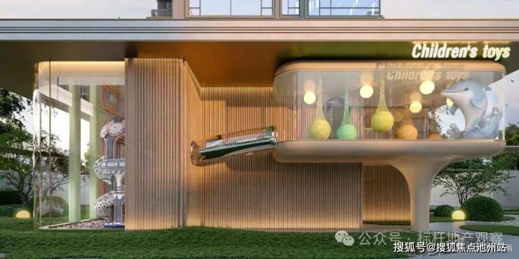相比同系作品,沐芳洲在此理念上进一步迭代。在这个多维架空空间里,规划了高差近10米约740㎡的下沉庭院、约1600㎡的室内恒温泳池、健身房等会所,并设置了层高约7.2米的童玩空间、阶梯书吧等多功能场所。