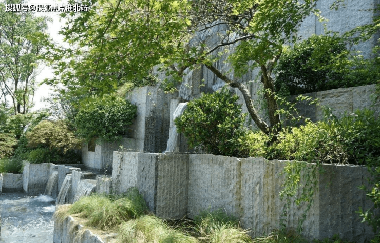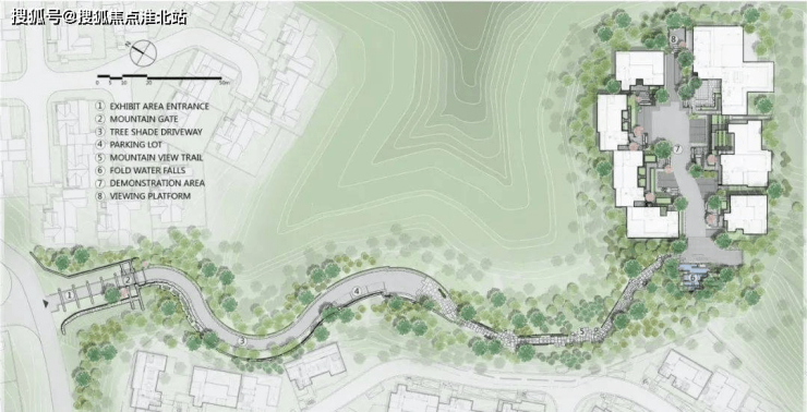 由平台处步行经过栈道、层层台阶便来到了5号地块的样板院区入口,入口结合现状的地势设计了一处跌水景观,