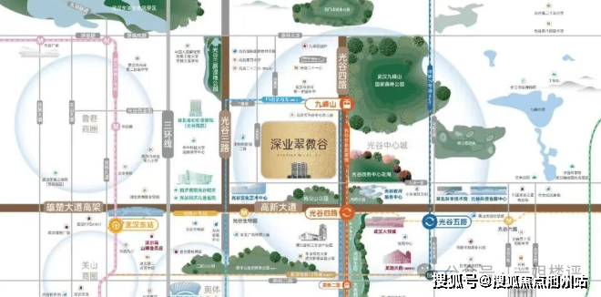 深业翠微谷正处光谷中心城门户位置,它位于九峰一路与光谷四路交汇处,紧邻高新大道主轴以及东湖高新区管委会,家门口还有5大公园环绕,占领了光谷顶尖土地资源。