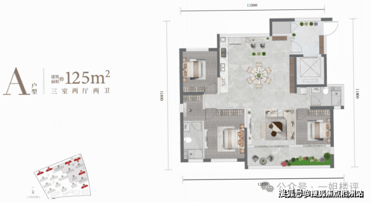 建面约125平三房两厅两卫:也是南北通透,三开间朝南,是项目门槛级户型。