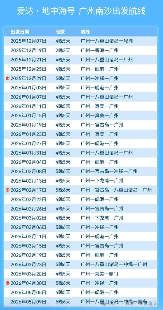 南沙国际邮轮母港:9月8日,南沙国际邮轮母港正式发布《南沙国际邮轮母港航班计划表(2025年12月—2026年5月)》,为期6个月的航季中,“爱达·地中海号”邮轮将于年底回归。