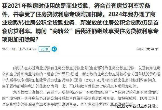 问:我2021年购房时使用的是商业贷款,符合首套房贷利率等条件,并享受了住房贷款利息专项附加扣除。2024年我办理了商业贷款转住房公积金贷款业务,新发放的住房公积金贷款仍是首套房贷利率。请问“商转公”后我还能继续享受住房贷款利息专项附加扣除吗?