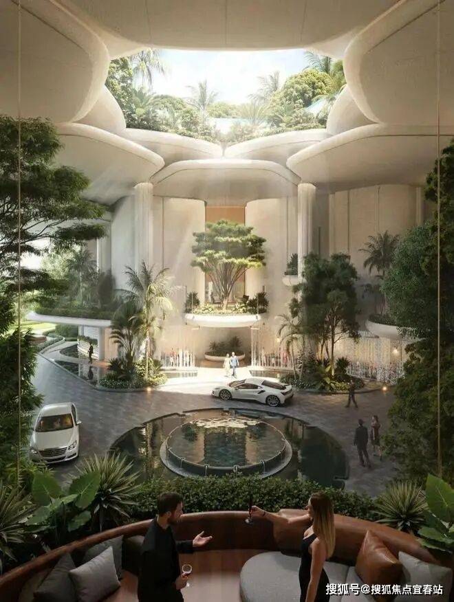 浮岛花园:底盘抬升,打造空中立体园林与泳池。