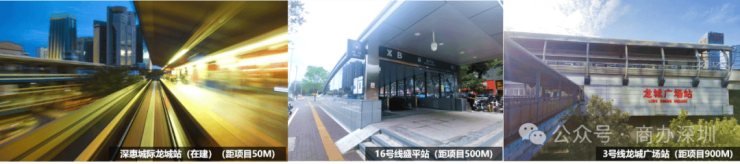 城市主干道龙翔大道与龙城大道交汇于此,距深惠城际(在建)龙城站约50米、距16号线盛平站约500米、距3号线龙城广场站约900米,交通便利,畅达全城!