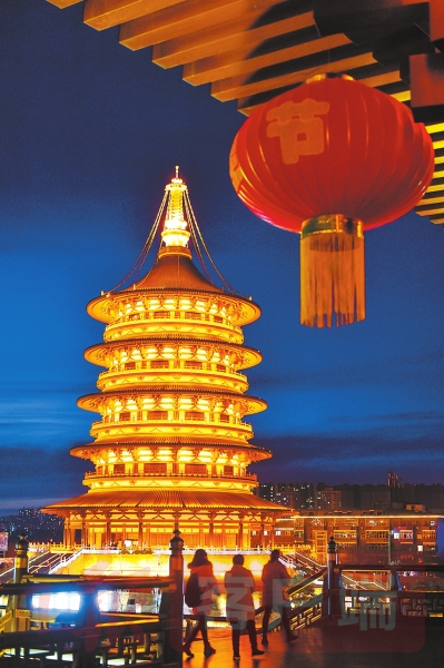 在今日洛阳定鼎路与中州路交叉口处,人们依史料记载样式,在两宫原址复建了明堂与天堂。每到夜晚,建筑周身亮起彩灯,令人怀想其昔时盛景。