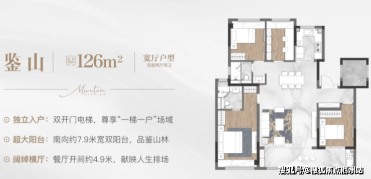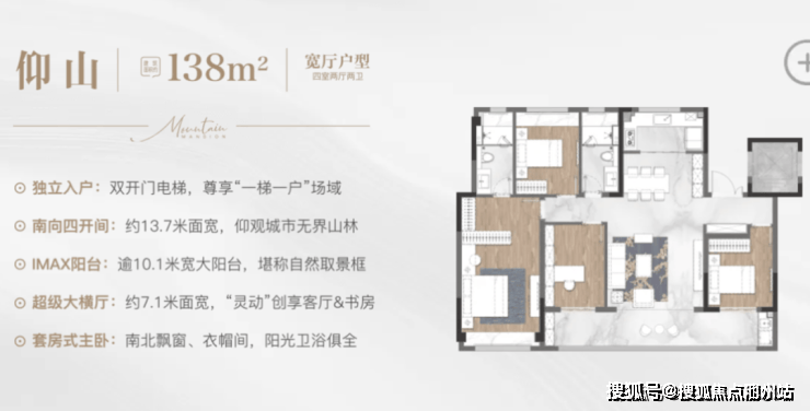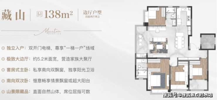 4.5米边厅+ 5.9 米阳台:横向采光面达 10.4 米,直面紫金山北麓山体,270° 转角飘窗将山景引入室内,对比高科迈上品院130㎡户型(仅3.6 米开间),景观视野提升近50%。