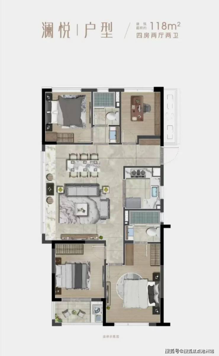 这样一片充满改善气质的土地,湖沁宸园几乎全部做了小户型。一共1760套可售房源中,100㎡以下小户型占比超过65%。这意味着,将会有上千套总价约200万的房源井喷入市。起步格局就是三房两卫。约98㎡中间套,南向面宽近10米,三开间朝南,客厅连着一个约3.5米宽的阳台。我数了下,整个户型可做到7面通风采光,包括两个明卫。约98㎡边套,拥有约5.7米宽的餐客一体化纵向大边厅。朝南次卧面宽也有约3米,为生活留足空间。预算宽裕一点的家庭,一步到位买个约118㎡边套。四房两卫格局,主卧配独立衣帽间,纵向一体化餐客厅尺度达到了约6米,还带一个大飘窗。