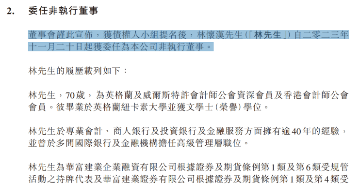 除化债之外,根据公告,融创董事会宣布,获债权人小组提名后,林怀汉自2023年11月20起获委任为本公司非执行董事。