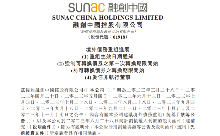 据了解,新票据、强制可转换债券及可转换债券预期将于2023年11月21日在新交所上市。融创服务股份已转让至计划债权人帐下。
