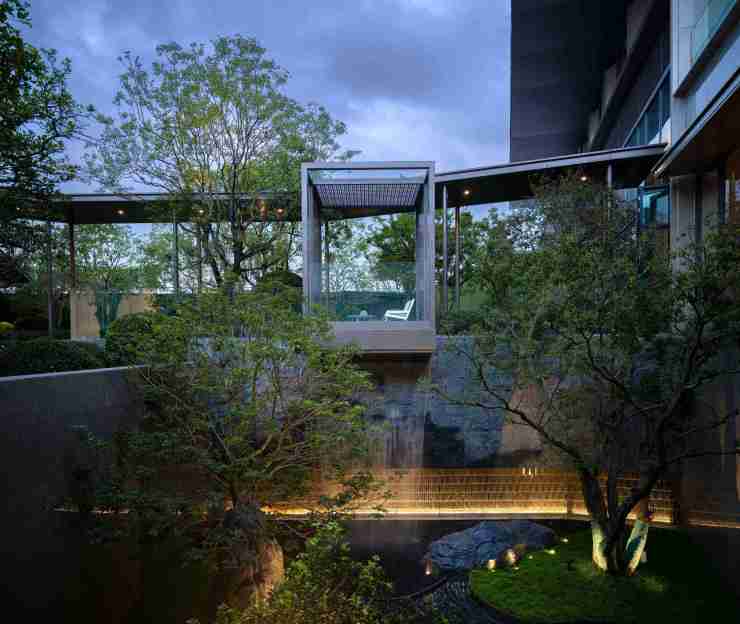 以“天圆地方”为设计理念,跌瀑水幕演绎道法自然的东方哲学。