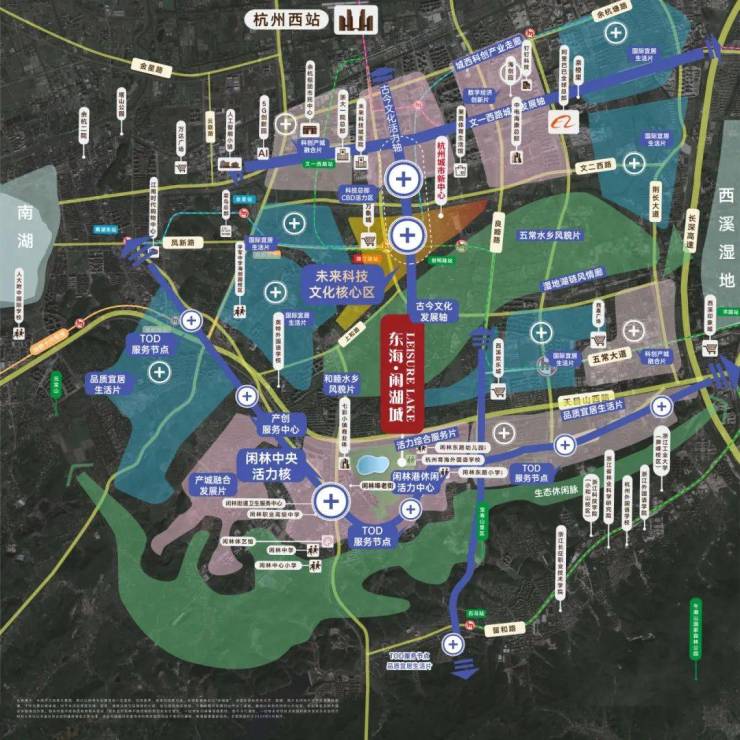 未来科技城被誉为中国经济引擎,杭州新中心,区域内注册企业涉及人工智能、芯片、数字经济、生物医药等高精尖科技产业。代表性的有阿里巴巴全球总部、菜鸟总部、之江实验室、海康威视等等。吸引顶尖人才集聚于此。闲湖城距离杭州未来科技城公共中心直线距离约3.5公里。