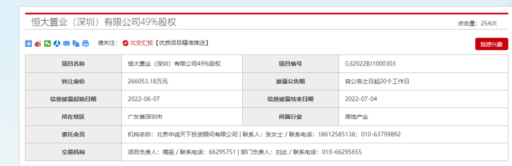 焦点财经讯 耿宸斐 据北京产权交易所消息,中国铁建股份有限公司子公司中国铁建投资集团有限公司挂牌出售恒大置业(深圳)有限公司49%股权,转让底价为26.6亿元。
