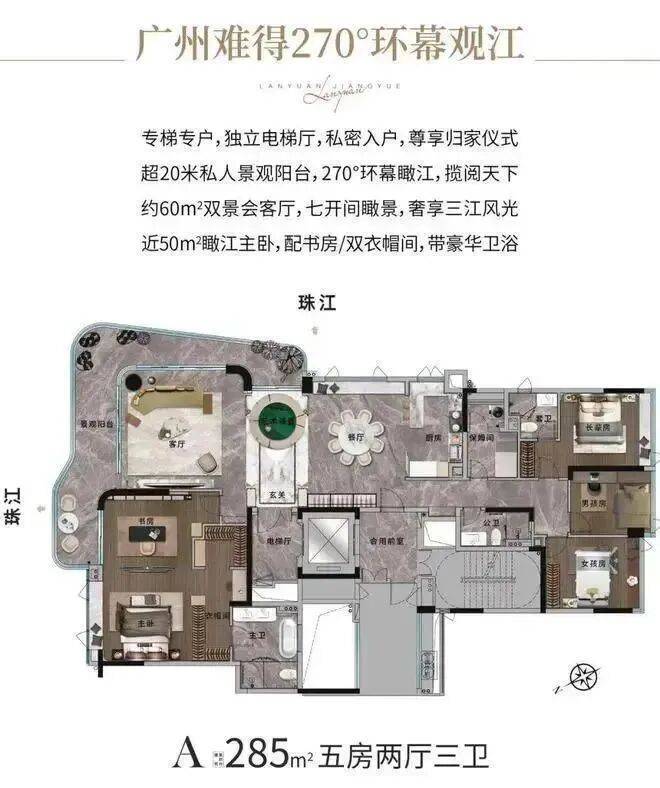 项目规划低密度18层,一梯一户,270°全景视野,拥享三面环江震撼景观。目前只做了两种户型:193㎡和285㎡江景大平层。