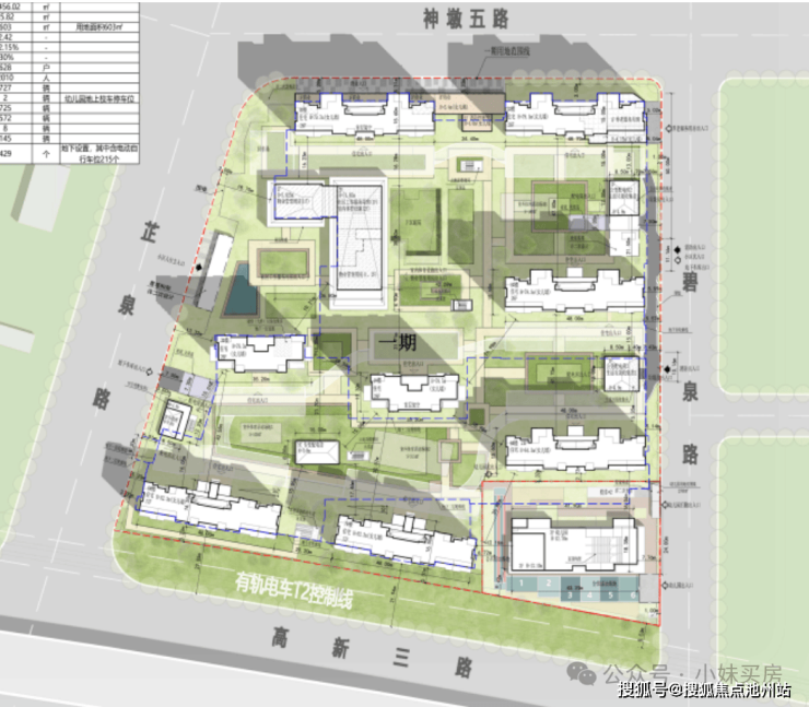 一期西侧临近有轨电车,南侧临近关豹高速,可能有一定噪音影响。特别是一期6、7#紧挨着关豹高速,其中6#、7距离关豹高速差不多都在22米左右。