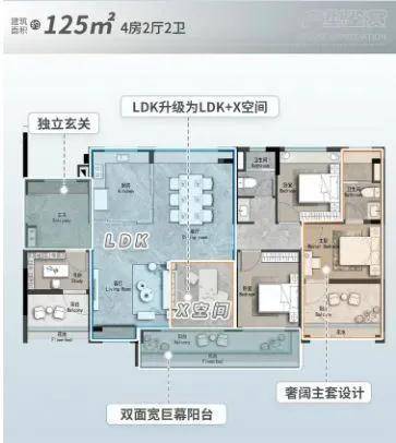 125㎡四房在舒适性上进一步提升,四开间朝南,阳台长度达到6米,连接客厅与次卧,主卧配备独立衣帽间和干湿分离卫生间,动静分区清晰,适合改善家庭 。