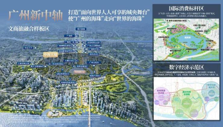 广州新中轴以“打造面向世界、全民共享的城市核心舞台”为整体定位,肩负文商旅融合示范区、国际消费标杆区、数字经济引领区等多重核心职能。