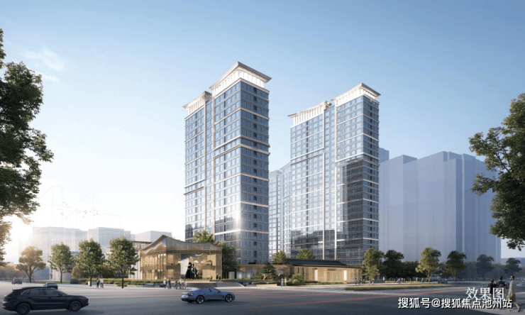 入口会所售楼处略微起翘的双坡屋顶,横向展开,均衡平直,类比于新中式建筑檐口的舒展感;转角独立小楼屋顶的金属挑檐模拟了层叠的古建檐口所形成的自然、简约的起伏;商业和楼栋基座有高度且有厚度的檐口线脚则是廊檐的抽象表达。配合石材、玻璃等现代材料的使用,克制凝练的设计手法,达到在当代转译新中式之美的设计理念。