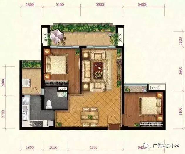 :两房两厅一卫,直出阳台可观芙蓉嶂山湖美景 。双阳台设计实现动静分区,既保证生活起居的私密性,又能在闲暇时欣赏窗外山湖风光 。