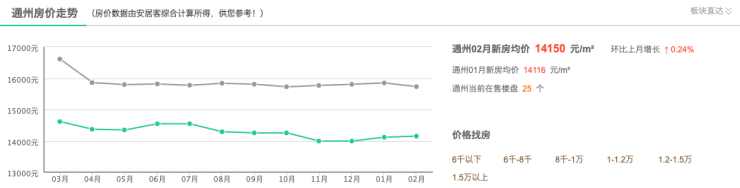 而根据安居客平台披露的信息,通州2月新房均价为14150元/平方米,环比上涨0.24%;当前在售楼盘为25个。