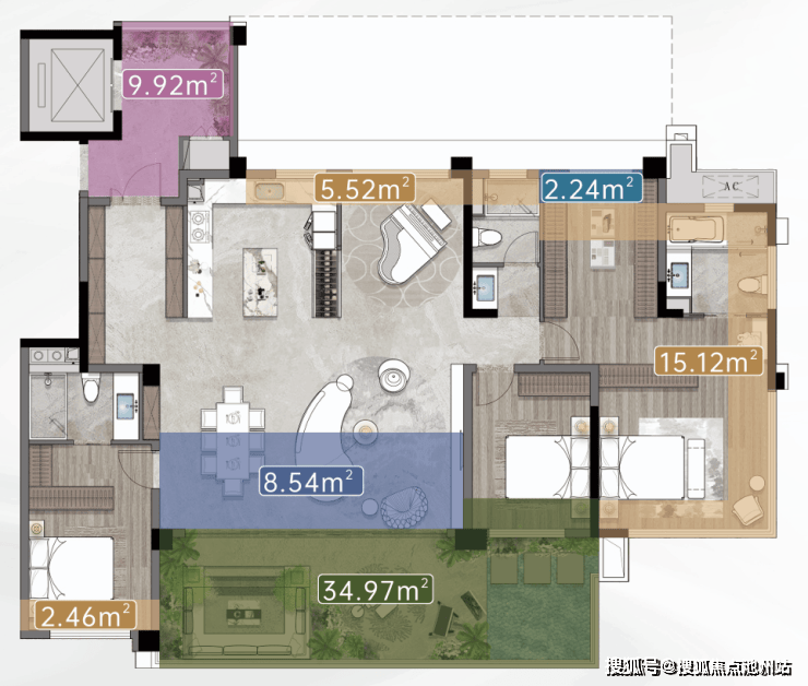 简洁干练的建筑轮廓,搭配香槟金+莫兰迪灰+贝金米黄的融洽色彩点缀,整体颜值非常高雅,经久耐看。