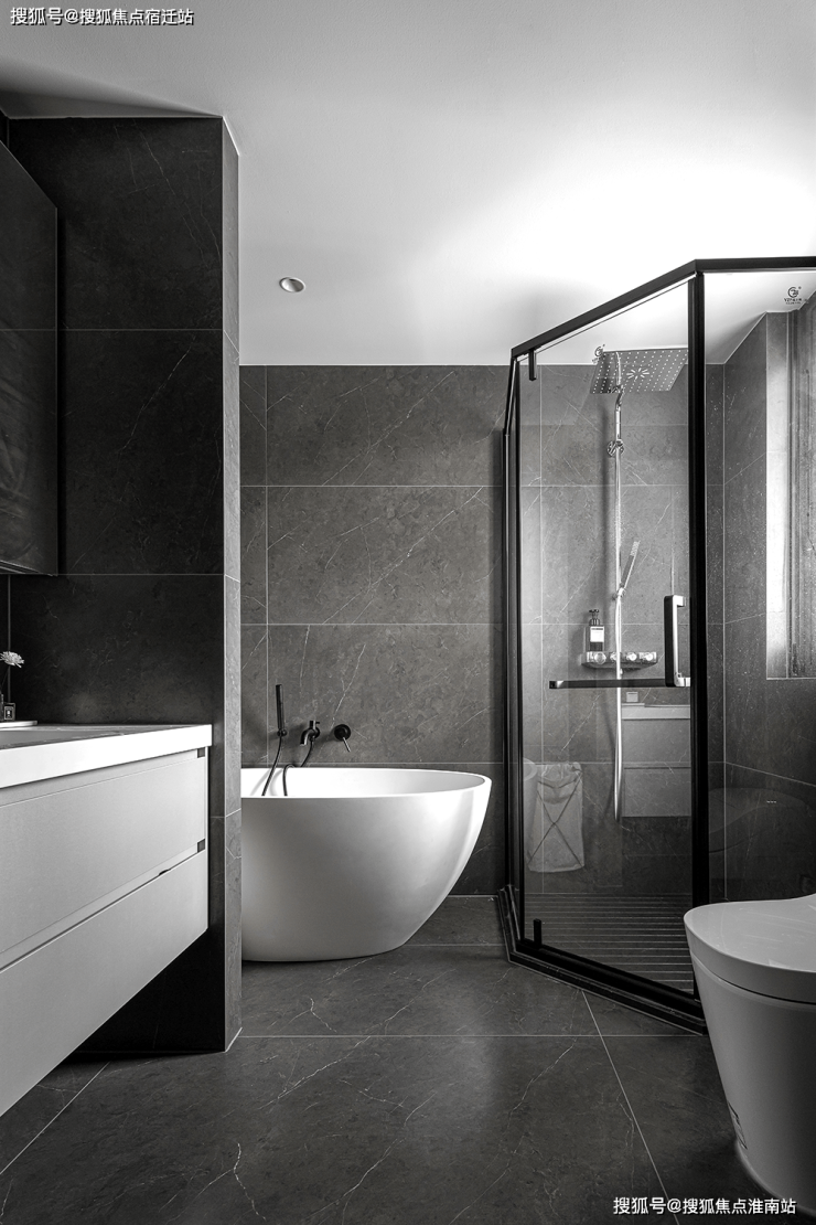 The bathroom also continues the black and white color matching of the mansion, the black background and the white ceramic bath design complement each other, showing an extreme sense of advanced, allowing people to immerse in the realm of luxury and comfort, and feel the beauty and comfort of life.