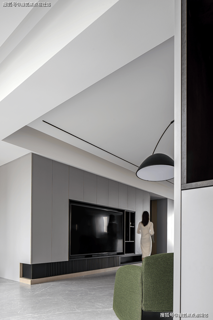 双层吊顶设计,巧妙地赋予了空间更丰富的层次感。客厅沙发的背景墙采用灰色硬包材料,点缀金属线条,简约中透露着大气与优雅。