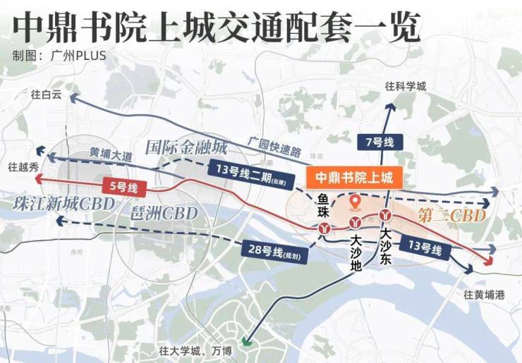 南门步行1.1公里至5号线大沙地站,9站直达珠江新城(约31分钟),5站至金融城(约17分钟)。可通过大沙东站换乘7号线,增强东西向通达性。