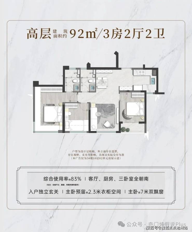 建面约 93㎡超享三房,约82%综合使用率,堪称百平米内最舒适的高层三房!