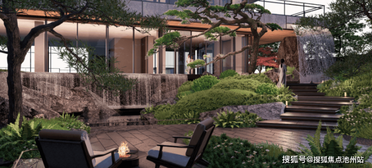 前场景观中非常多的运用了名贵山石、松林、游鱼、流水,打造了具有中式风韵的庭院小径,所有设计元素和灵感都来源于自然景观,才能呈现出简约、自然、和谐的美感。