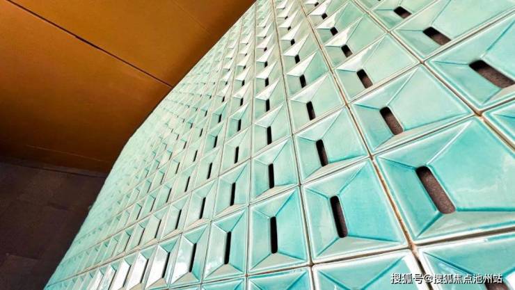 墙面通过定制化的冰裂纹天青色汝窑陶瓷排版形成天青府的主题记忆色彩。将宋徽宗笔下的那抹东方色彩“雨过天青云开处”——天青色映入眼帘。