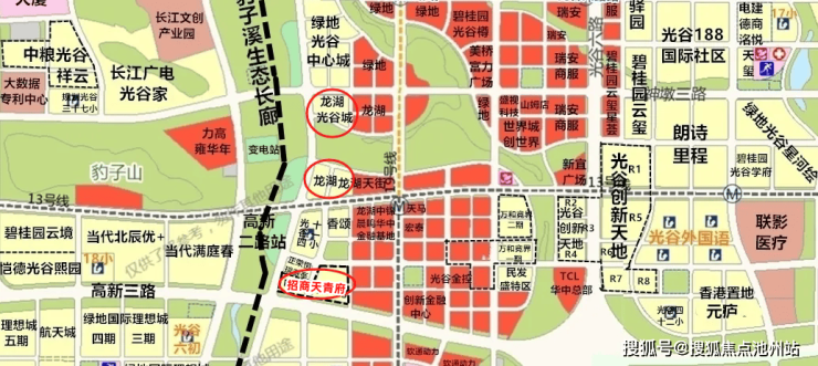 距离19号线新月溪公园约600米,属于光谷中心城在售楼盘中,距离地铁站较近的项目。此外,项目到光谷空轨站高新二路直线距离约400米,也不算远。靠近大悦城,距离约2公里,西侧约200米是光谷生态大走廊。