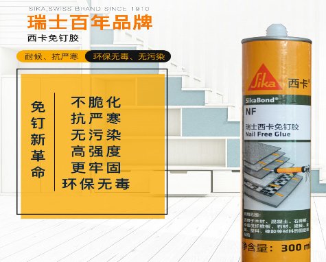 SIKA免钉胶产品——免钉胶SikaBond NF,可快速固化并拥有优异的粘接性能,完全固化后具有高荷载性能,直接取代钉子,免打孔,更安全。而且粘结层非常薄,特别适用于修补掉砖,修补后的砖面与原有砖面无明显高低差,且固化后牢固耐久。