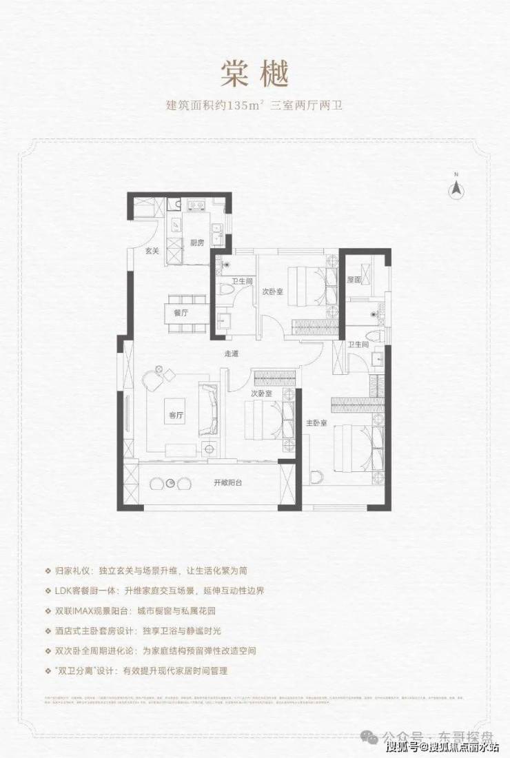 2、建面约135平米的三室两厅两卫。