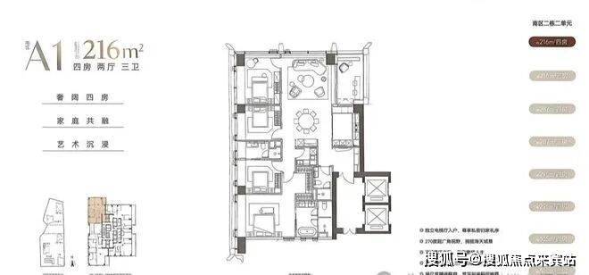 ——低区:自5层起(建筑高度不超过150米),主力打造建面约209—304㎡的四房阔景大宅;