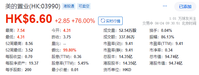 6月24日,港股开盘后,美的置业盘中涨超70%。