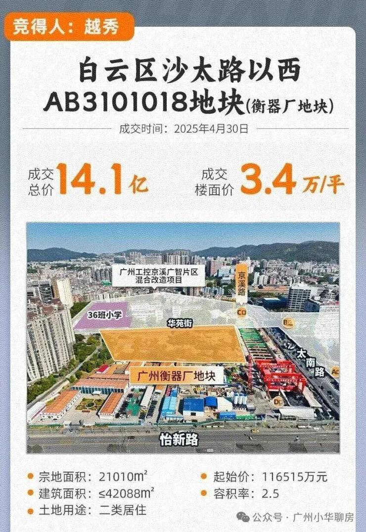 4月30日,最终,经过26次竞价举牌,越秀地产以14.1515亿元竞得白云区沙太路以西AB3101018地块,溢价率21.46%,成交楼面价33623元/㎡!