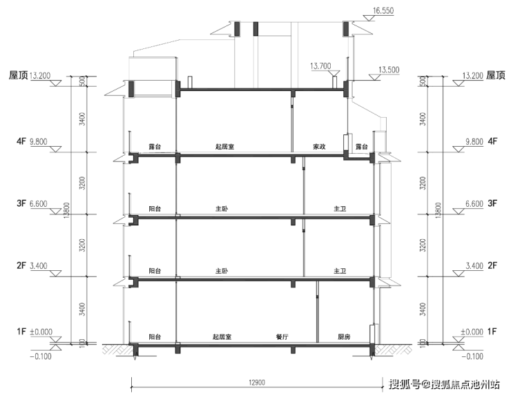 我以前一直不建议买叠拼,原因就是开间太小,但现在的叠拼基本解决了这个问题。这次姚江润园的叠拼,开间来到了约11.5米,客厅开间约7.7米。包括他的层高,也比以往的叠拼要高,下叠首层层高约3.4米,二层约3.2米。上叠因为做了倒置处理,所以是二层约3.4米,一层约3.2米(下图)。这个自己理解一下,是现在很流行的做法,避免了业主去顶楼露台还需要经过卧室区的问题。所以说,现代叠拼的空间尺度感是拉满的,完全配得上“墅”的说法。