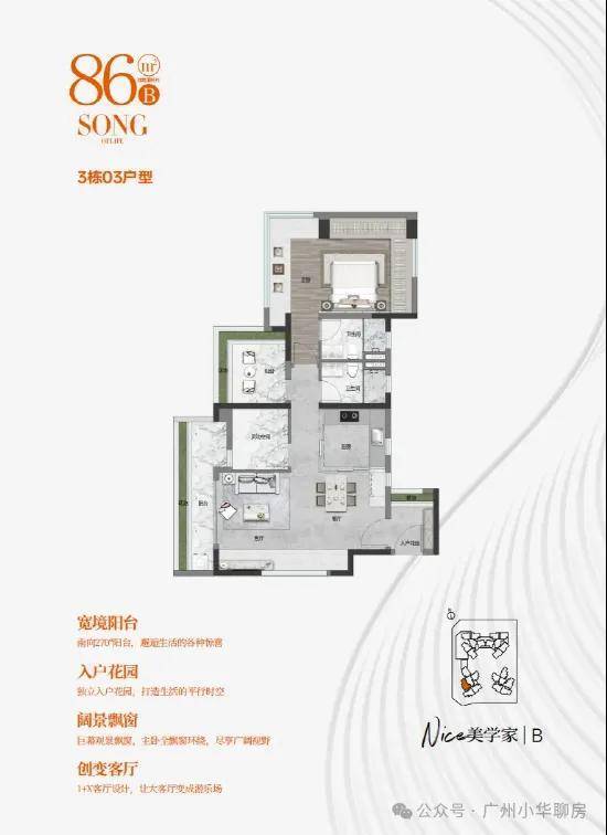 ▪南北对流 ,三开间朝南望中心花园,1+X客厅设计,客厅开间约3.8米