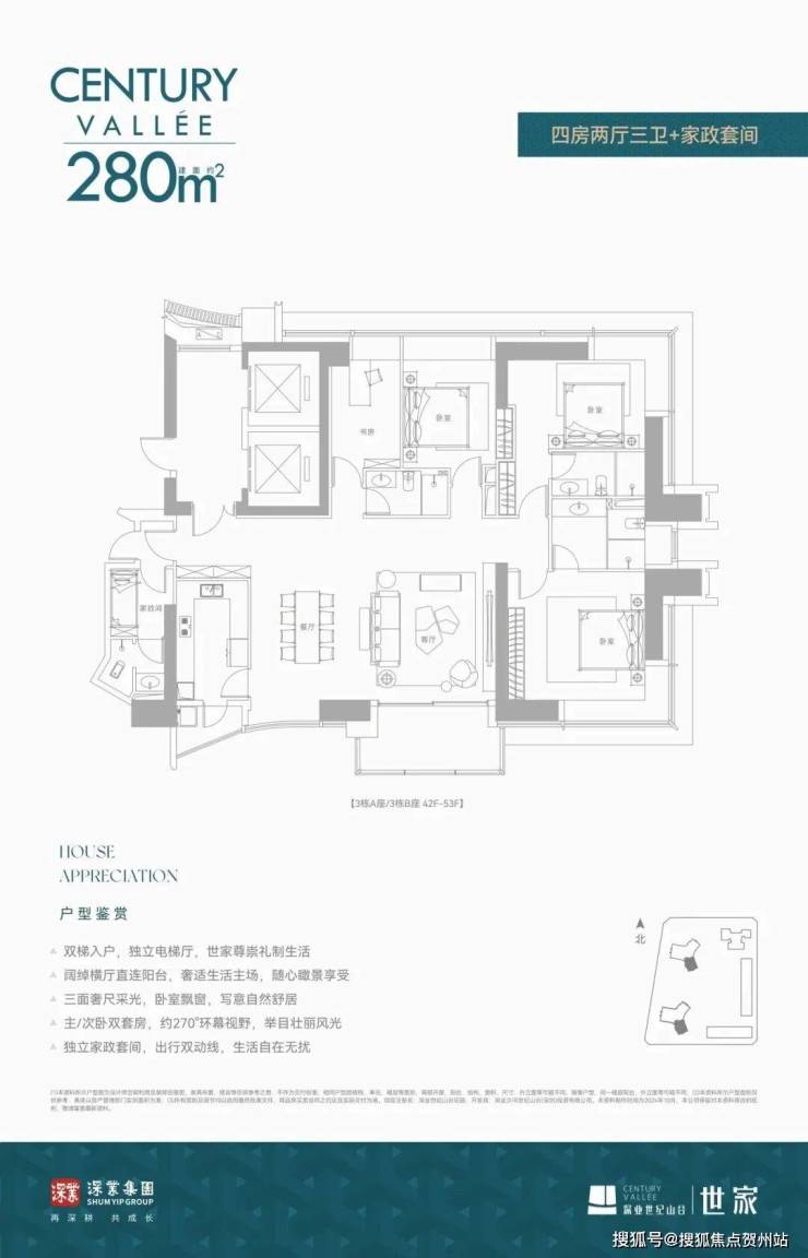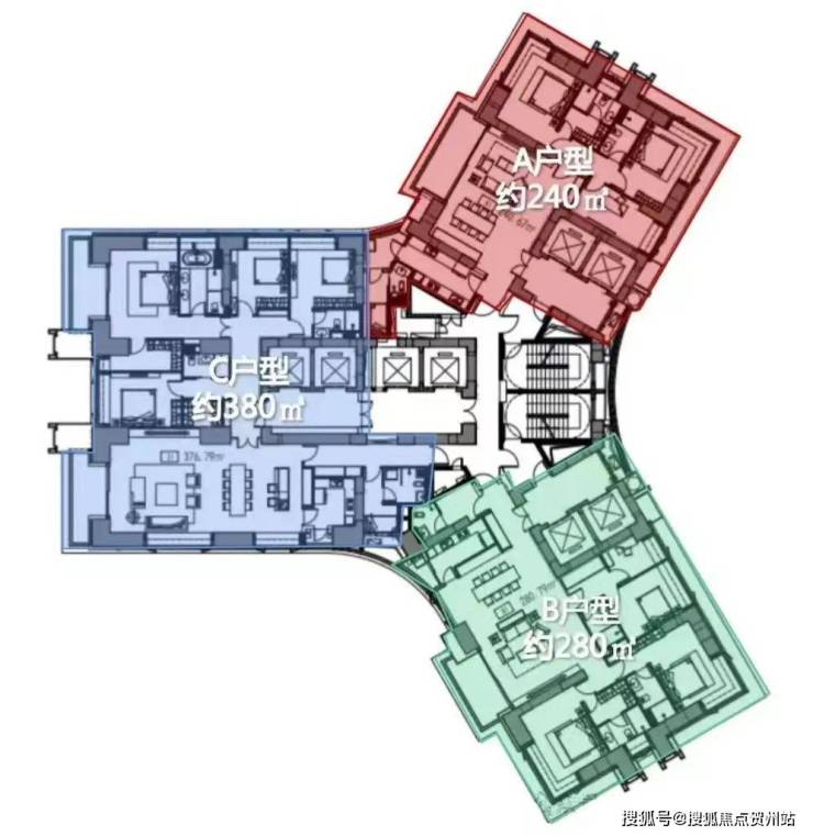 户型面积:240㎡、280㎡(3-4房)、380㎡(4+1房),梯户比为8梯3户,部分户型配备独立电梯