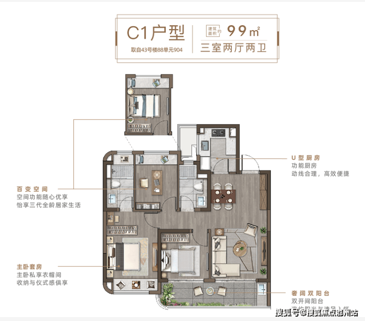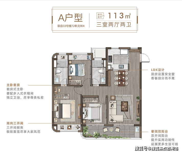 主卧套房设计,建面约99㎡、113㎡主卧套房带独立卫浴、宽大衣橱空间让衣物分类放置、收纳自如,独立卫浴,静享二人世界私密时光,尽情拥抱惬意、舒适的精致生活。