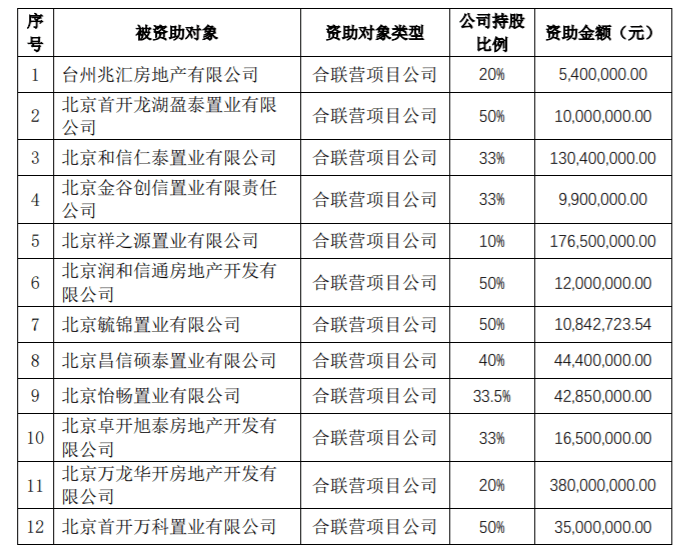 据其5月30日公告,今年1月7日至5月11日期间,该公司因财务资助事项所发生的金额累计已达33.01亿元。其中,向12家合联营项目公司提供财务资助的金额为8.74亿元;向2家与控股股东北京首都开发控股(集团)有限公司(简称“首开集团”)(含其控股子公司)共同投资的项目公司提供的财务资助金额为1001万元。